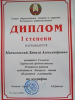 Поздравляем!!! Маньковского Данилу, учащегося 8 класса, занявшего 1 место в районном этапе областной олимпиады по географии. Благодарим учителя географии Тарасенко Клавдию Андреевну за качественную подготовку!
